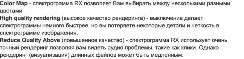 Type - RX предлагает несколько различных методов для отображения времени и частоты на спектрограмме. RX имеет расширенные режимы спектрограммы, которые позволяют вам видеть с большим разрешением по шкале времени (горизонтально) и частоты (по вертикали). Существует всегда компромисс качества изображения и времени обработки, так что имейте в виду, что некоторые режимы требуют больше времени, для отображения на экране, чем другие.