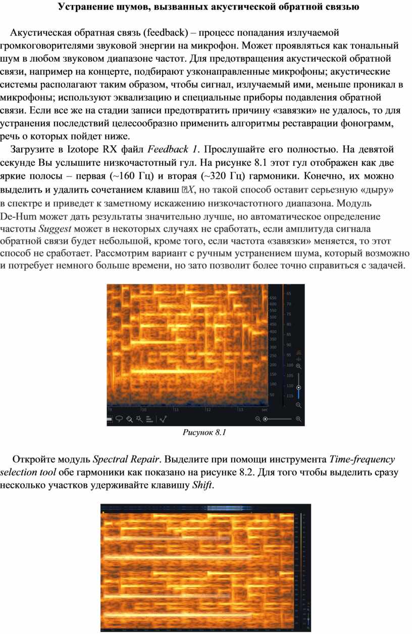 Акустическая обратная связь (feedback) – процесс попадания излучаемой громкоговорителями звуковой энергии на микрофон. Может проявляться как тональный шум в любом звуковом диапазоне частот. Для предотвращения акустической обратной связи, например на концерте, подбирают узконаправленные микрофоны; акустические системы располагают таким образом, чтобы сигнал, излучаемый ими, меньше проникал в микрофоны; используют эквализацию и специальные приборы подавления обратной связи. Если все же на стадии записи предотвратить причину «завязки» не удалось, то для устранения последствий целесообразно применить алгоритмы реставрации фонограмм, речь о которых пойдет ниже.