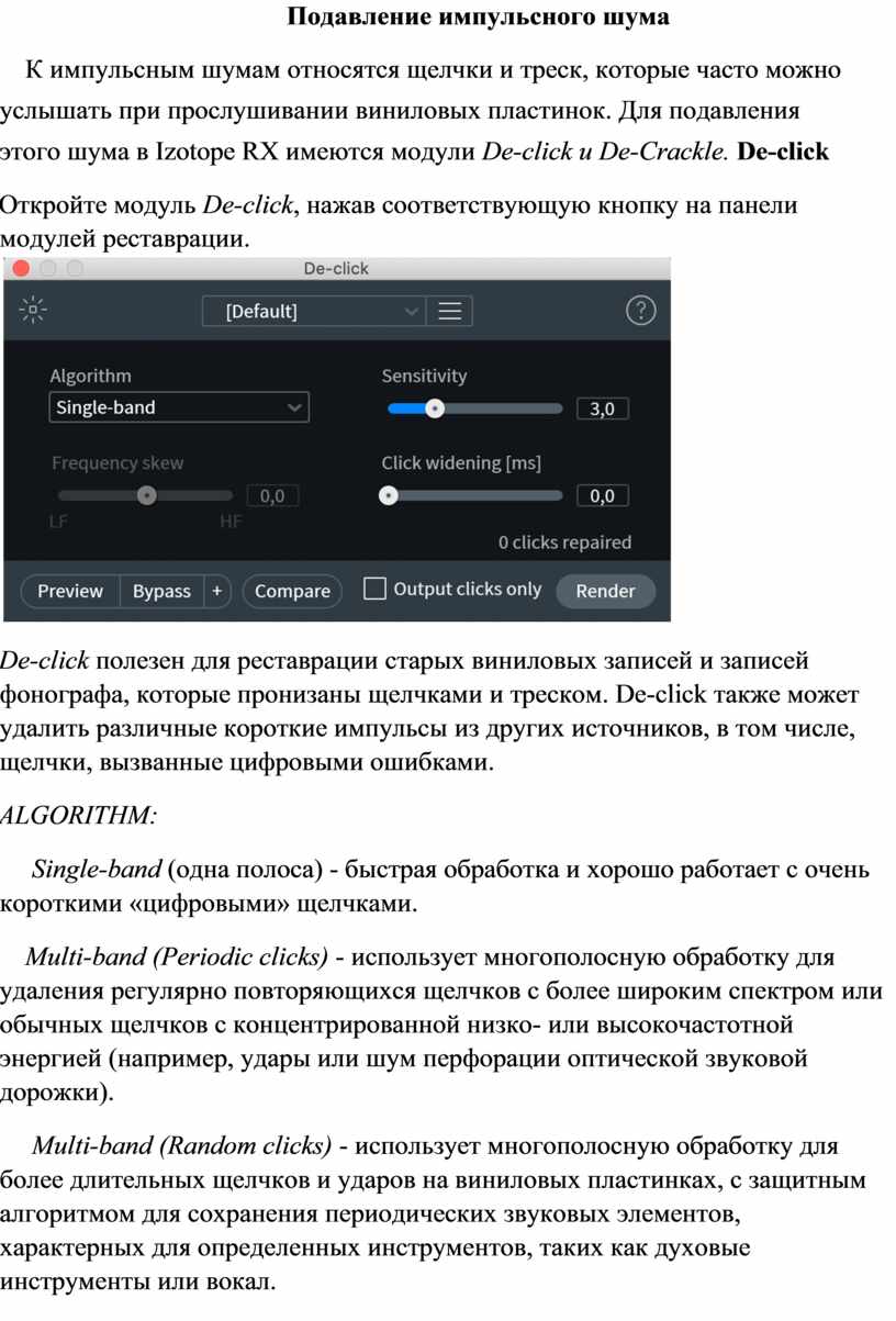 К импульсным шумам относятся щелчки и треск, которые часто можно услышать при прослушивании виниловых пластинок. Для подавления этого шума в Izotope RX имеются модули De-click и De-Crackle. De-click