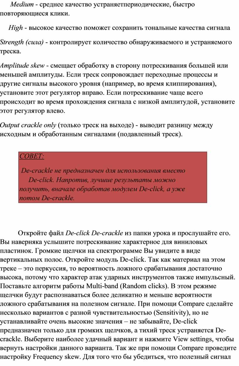 De-click. Напротив, лучшие результаты можно получить, вначале обработав модулем De-click, а уже потом De-crackle.
