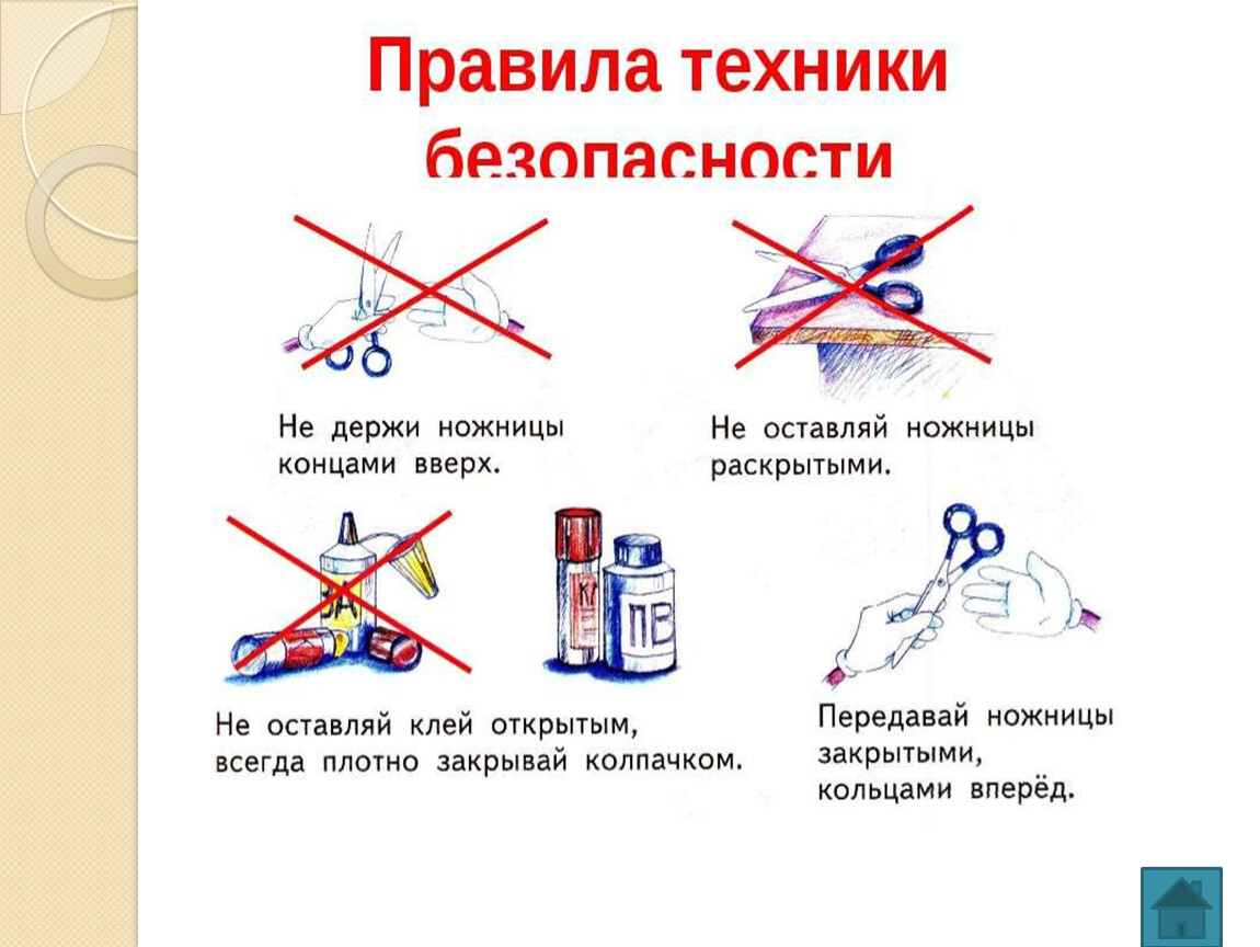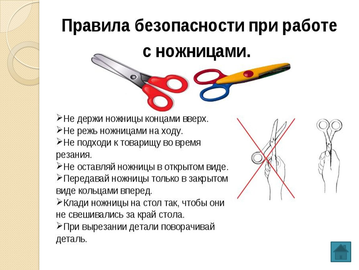 5. Ножницы хранить в определенном месте, класть их сомкнутыми острыми концами от себя, передавать друг другу ручками вперед.