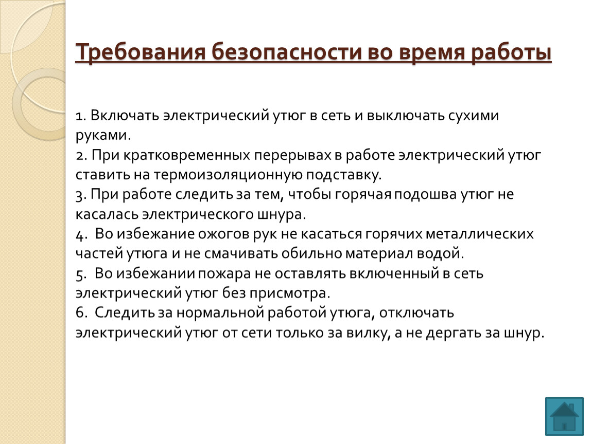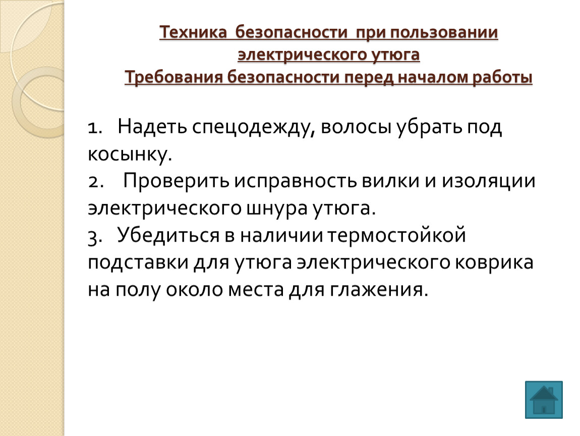 Техника безопасности при пользовании электрического утюга Требования безопасности перед началом работы