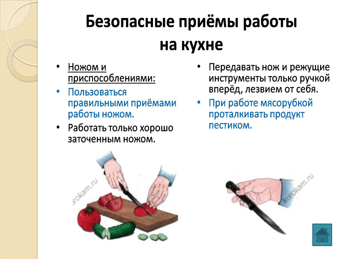 Слайд13 ………………… безопасные приёмы работы на кухне