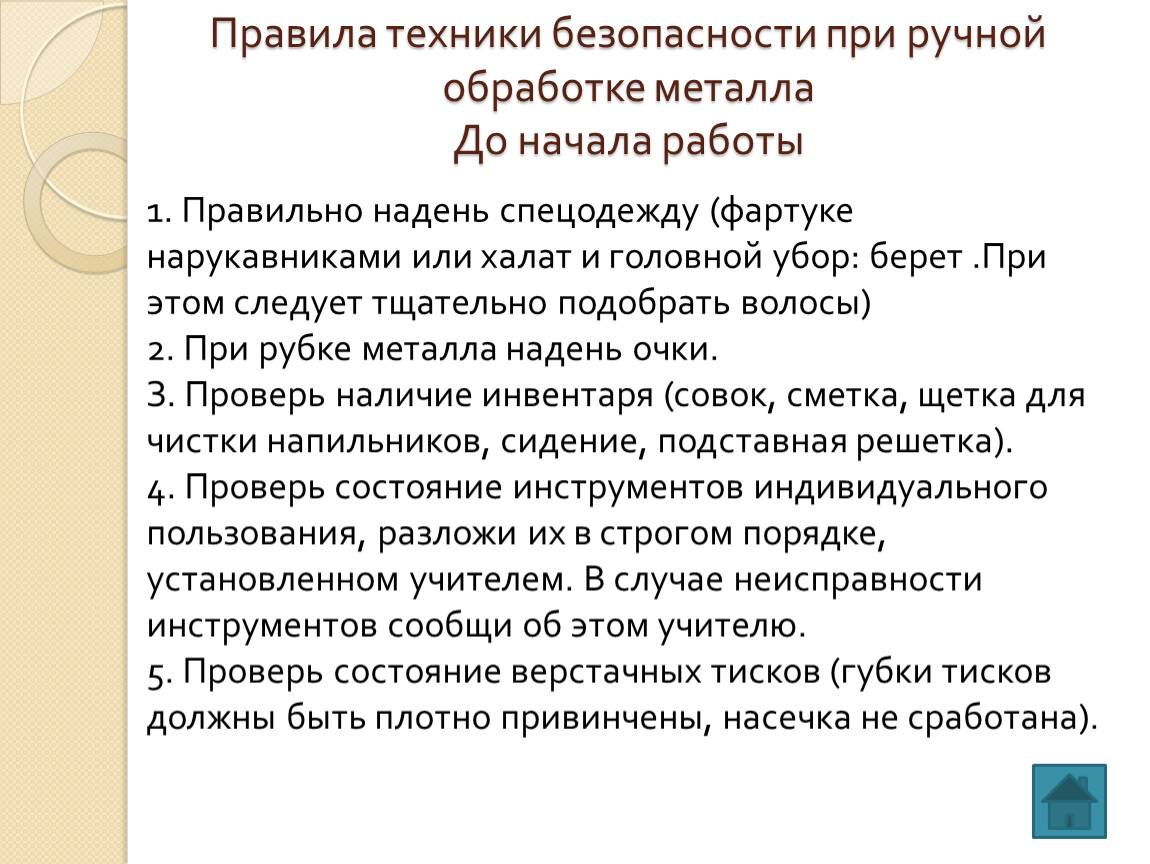 Правила техники безопасности при ручной обработке металлаДо начала работы