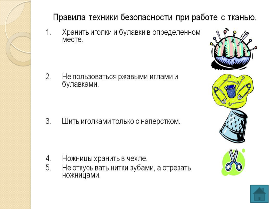 1. Хранить иголки и булавки в определенном месте (подушечке, специальной коробке и пр.), не оставлять их на рабочем месте.