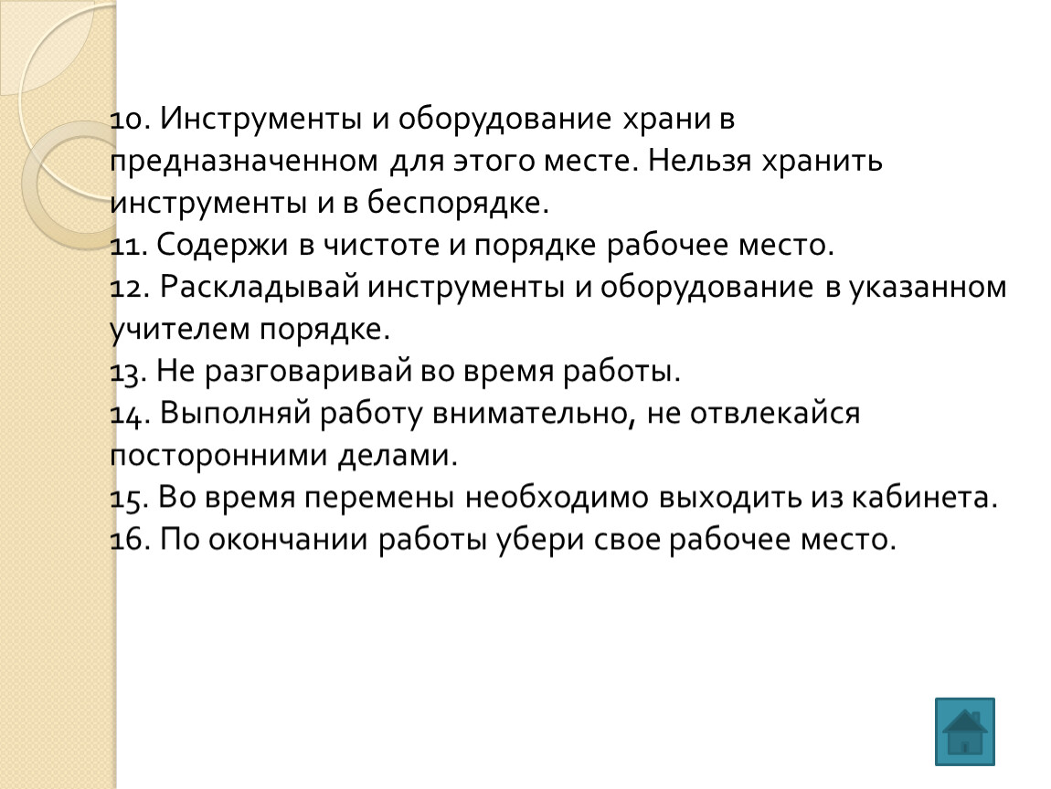 10. Инструменты и оборудование храни в предназначенном для этого месте. Нельзя хранить инструменты и в беспорядке.
