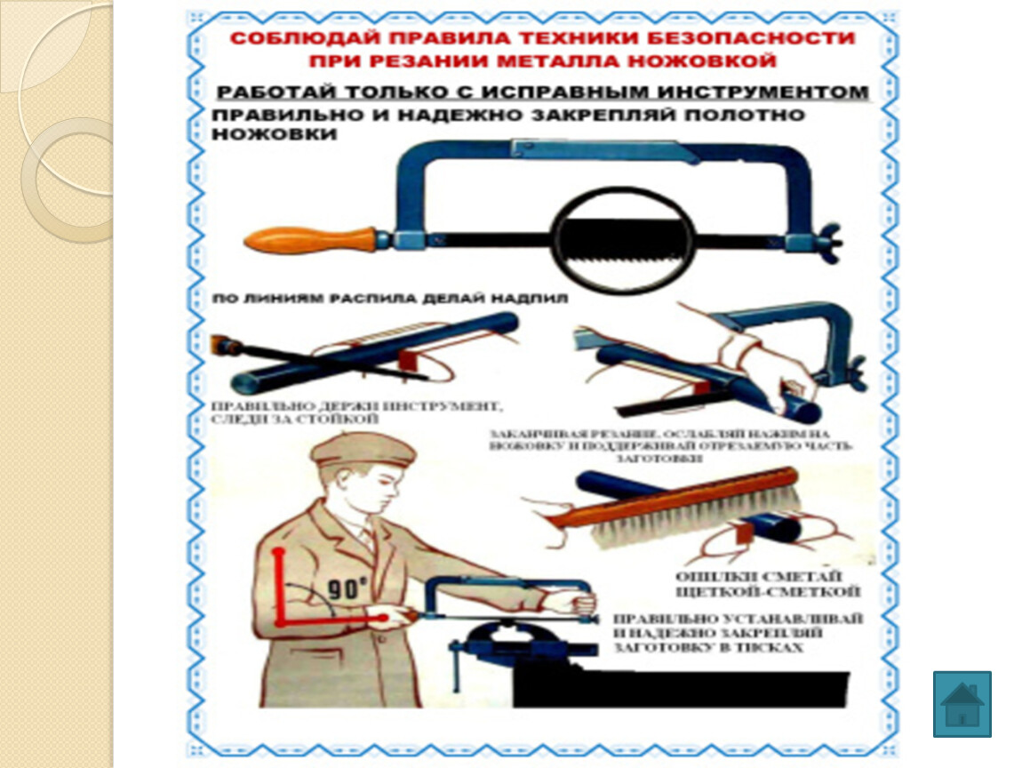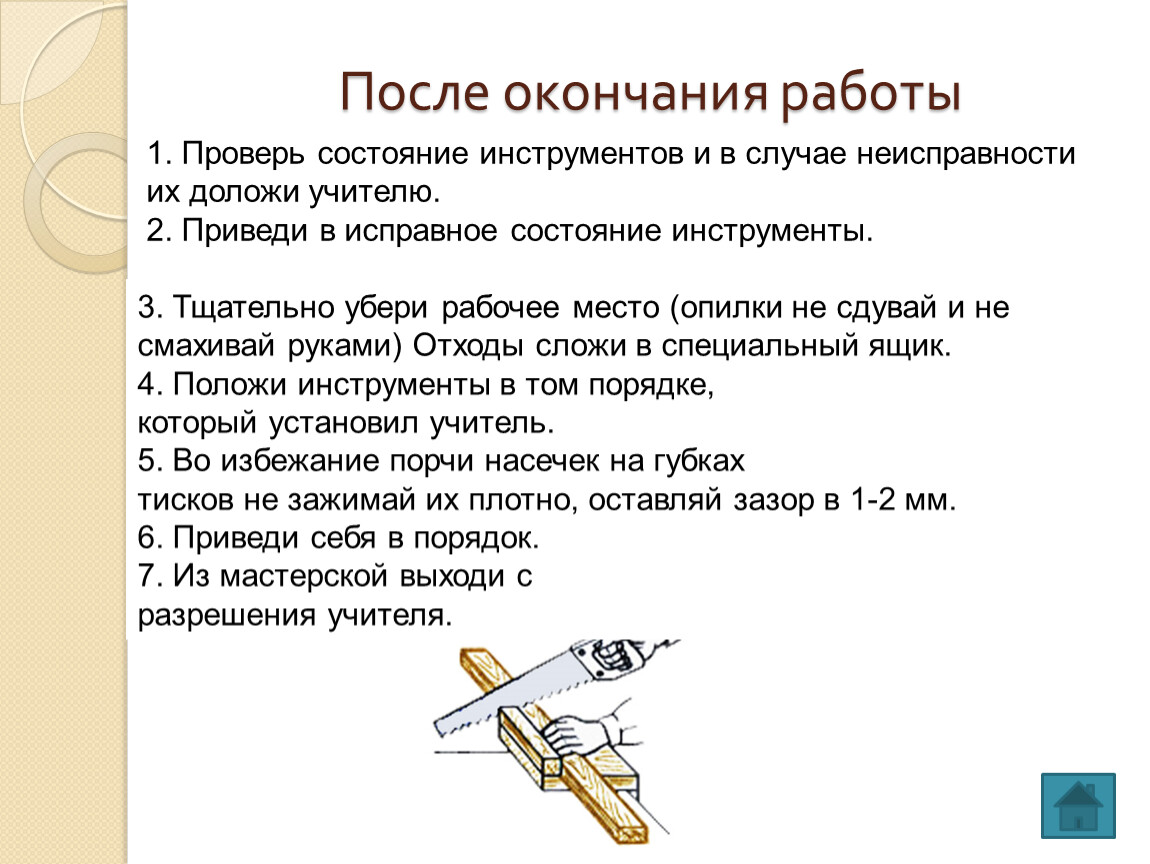 в) при работе с ножовкой выполняя запил используй приспособления.