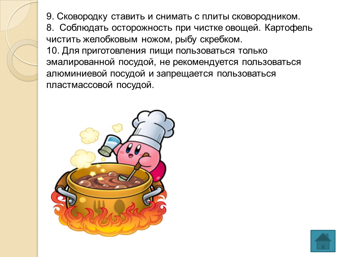 7. Следить, чтобы при закипании содержимое посуды не выливалось через край, крышки горячей посуды брать полотенцем или прихваткой и открывать от себя.