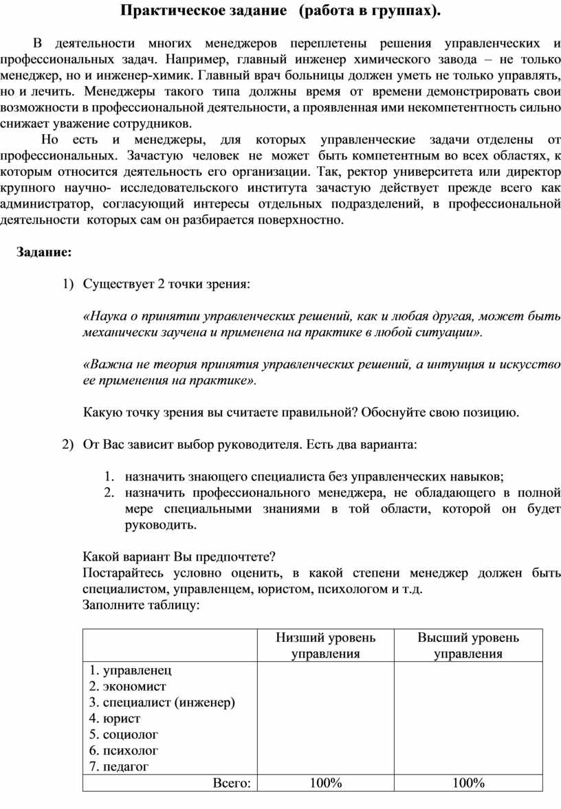 Постарайтесь условно оценить, в какой степени менеджер должен быть специалистом, управленцем, юристом, психологом и т.д.