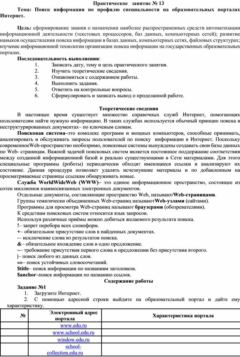 Тема: Поиск информации по профилю специальности на образовательных порталах Интернет.
