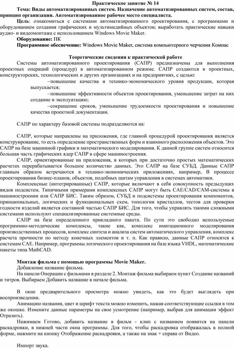 Цель: ознакомиться с системами автоматизированного проектирования, с программами и оборудованием создания графических и мультимедийных объектов; выработать практические навыки аудио- и видеомонтажа с использованием Windows Movie Maker.