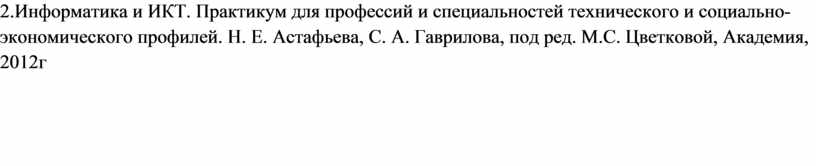 2.Информатика и ИКТ. Практикум для профессий и специальностей технического и социально-экономического профилей. Н. Е. Астафьева, С. А. Гаврилова, под ред. М.С. Цветковой, Академия, 2012г