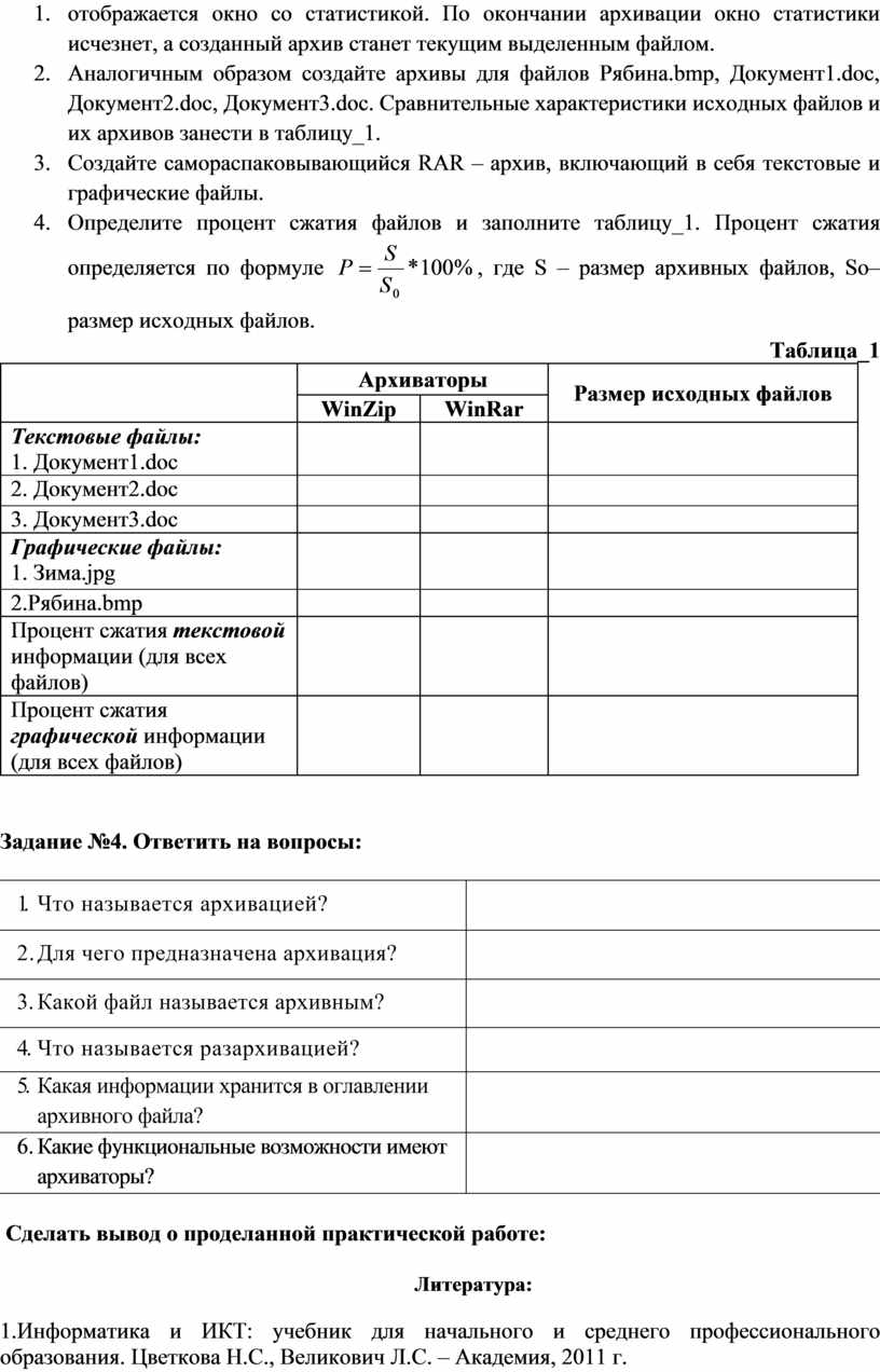 Оборудование, программное обеспечение: ПК, ОС Windows, программа для архивации данных WinZip, WinRar.
