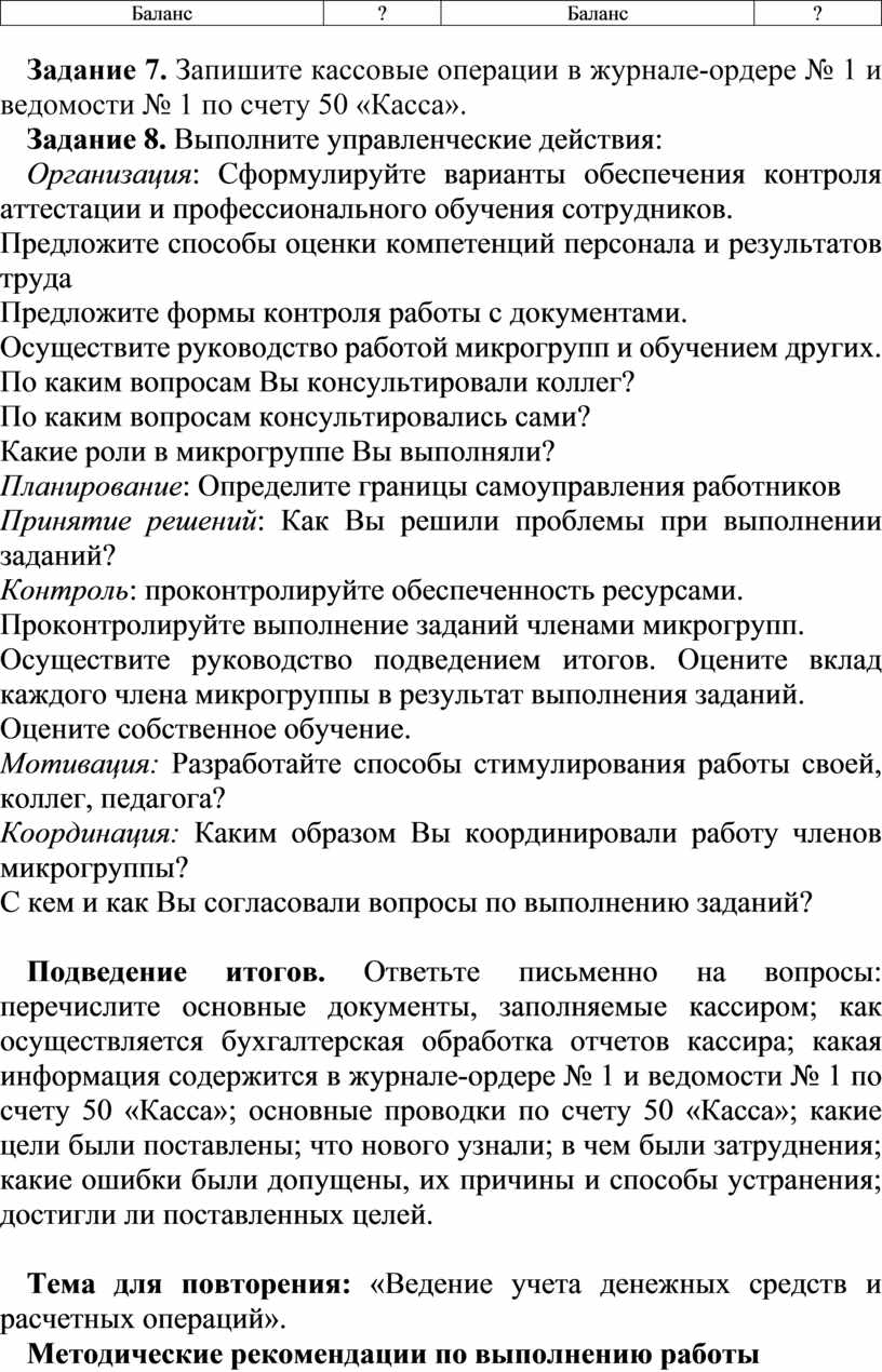 Подведение итогов. Ответьте письменно на вопросы: перечислите основные документы, заполняемые кассиром; как осуществляется бухгалтерская обработка отчетов кассира; какая информация содержится в журнале-ордере № 1 и ведомости № 1 по счету 50 «Касса»; основные проводки по счету 50 «Касса»; какие цели были поставлены; что нового узнали; в чем были затруднения; какие ошибки были допущены, их причины и способы устранения; достигли ли поставленных целей.