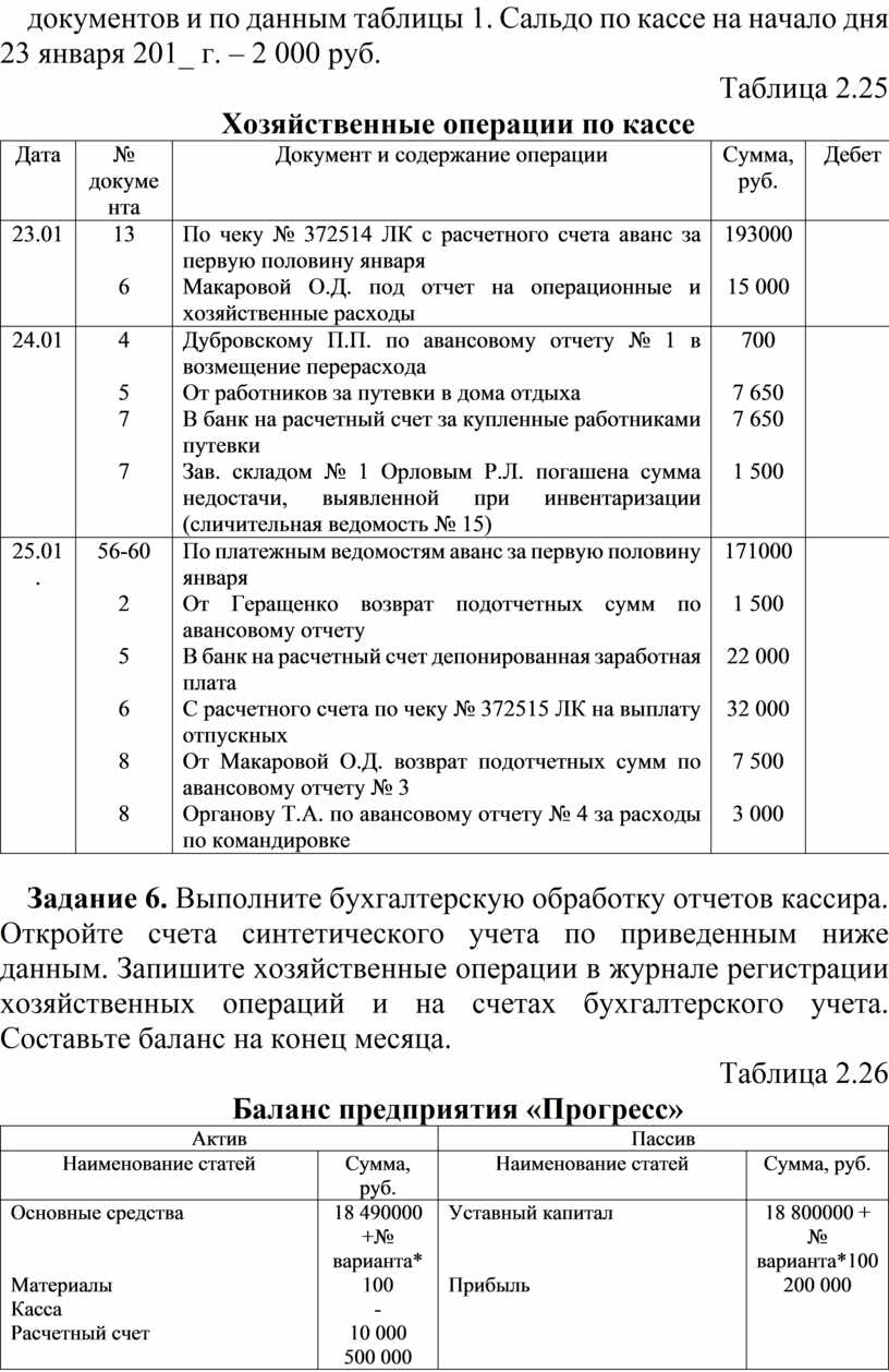 Задание 6. Выполните бухгалтерскую обработку отчетов кассира. Откройте счета синтетического учета по приведенным ниже данным. Запишите хозяйственные операции в журнале регистрации хозяйственных операций и на счетах бухгалтерского учета. Составьте баланс на конец месяца.