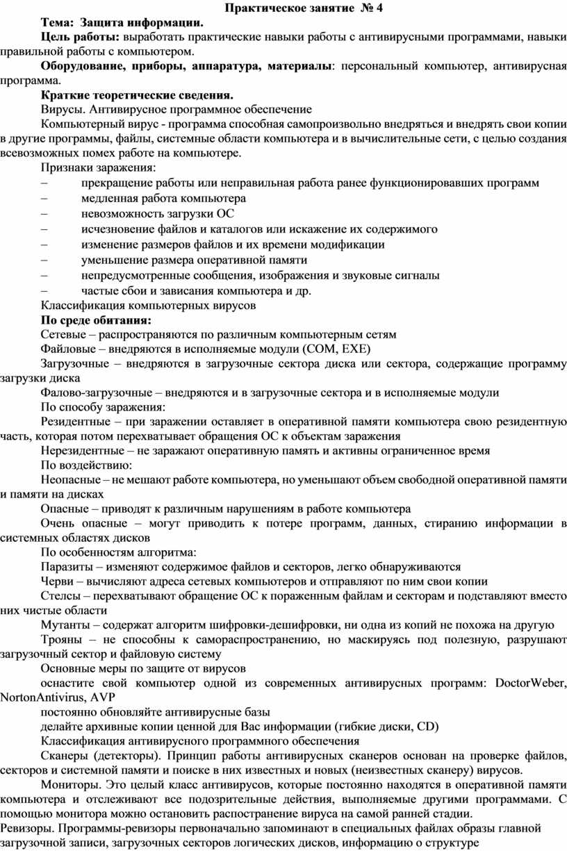 Оборудование, приборы, аппаратура, материалы: персональный компьютер, антивирусная программа.