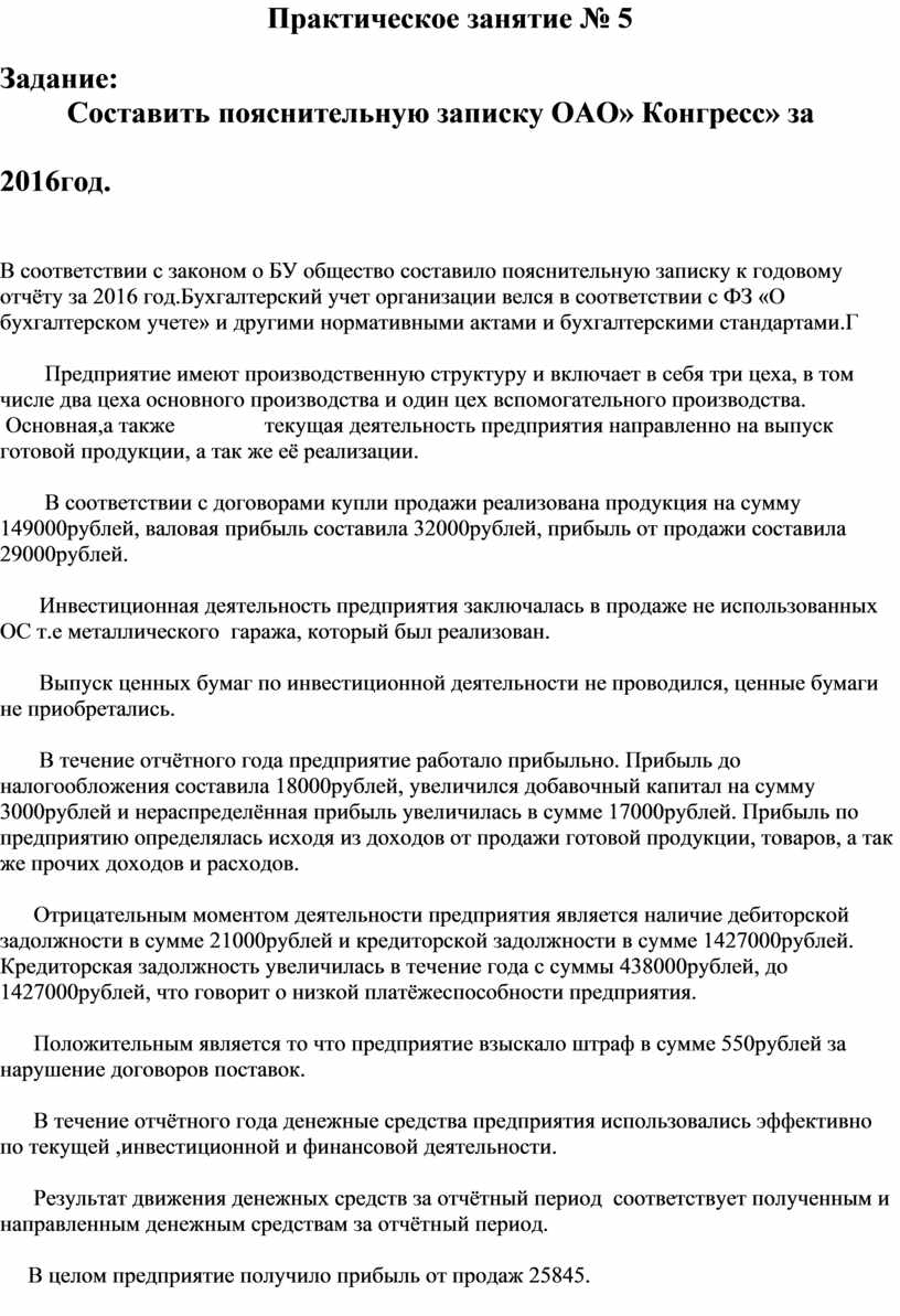 Составить пояснительную записку ОАО» Конгресс» за 2016год.