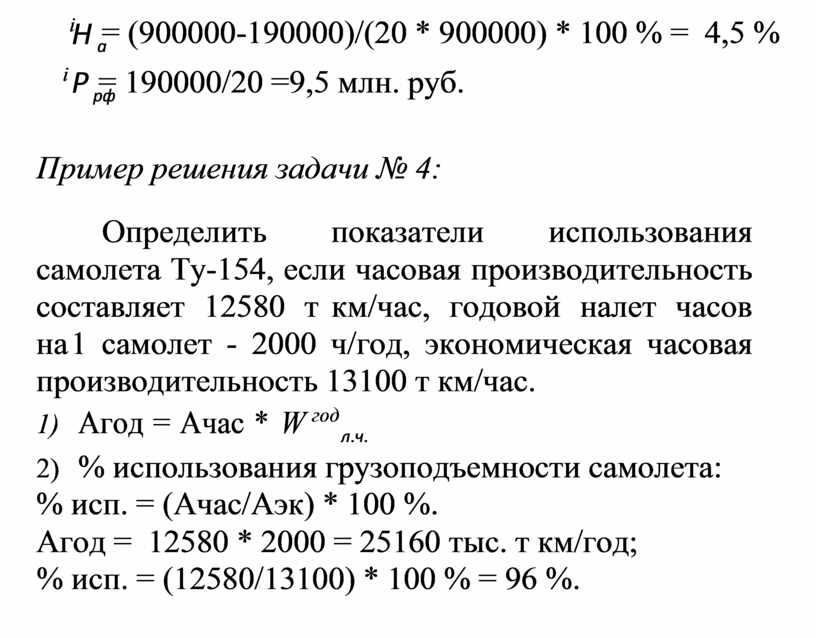 Определить показатели использования самолета Ту-154, если часовая производительность составляет 12580 т км/час, годовой налет часов на 1 самолет - 2000 ч/год, экономическая часовая производительность 13100 т км/час.