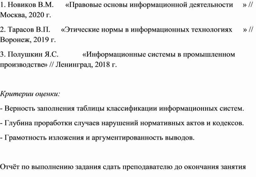 1. Новиков В.М. «Правовые основы информационной деятельности» // Москва, 2020 г.