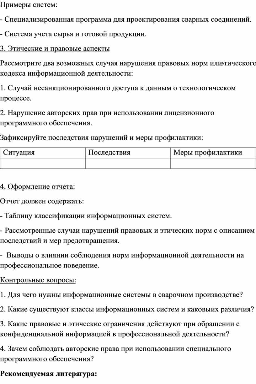 - Рассмотренные случаи нарушений правовых и этических норм с описанием последствий и мер предотвращения.