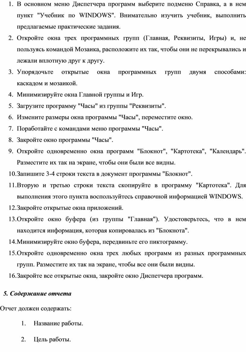 2. В основном меню Диспетчера программ выберите подменю Справка, а в нем пункт "Учебник по WINDOWS". Внимательно изучить учебник, выполнить предлагаемые практические задания.