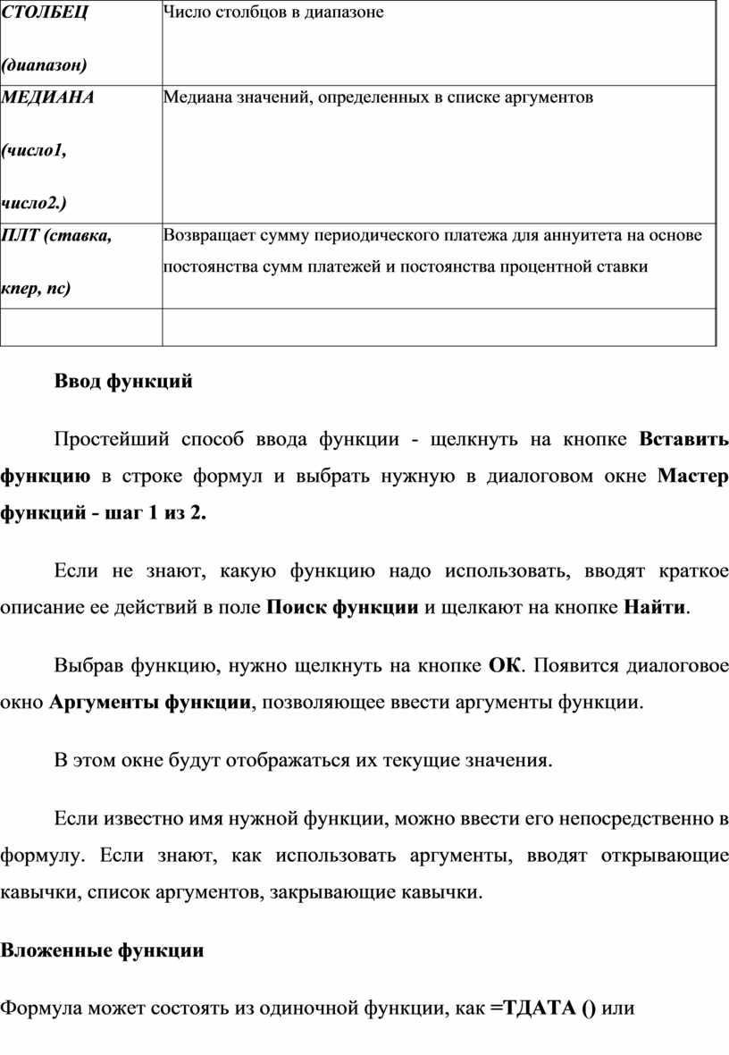 Простейший способ ввода функции - щелкнуть на кнопке Вставить функцию в строке формул и выбрать нужную в диалоговом окне Мастер функций - шаг 1 из 2.
