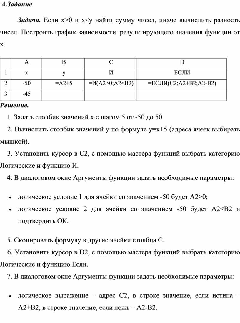 Задача. Если х>0 и x<y найти сумму чисел, иначе вычислить разность чисел. Построить график зависимости результирующего значения функции от х.