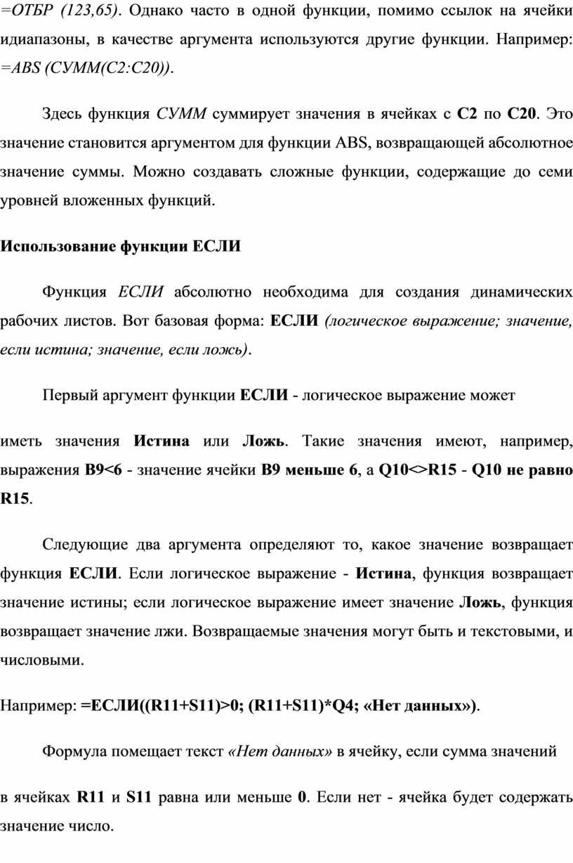 =ОТБР (123,65). Однако часто в одной функции, помимо ссылок на ячейки идиапазоны, в качестве аргумента используются другие функции. Например: =АВS (СУММ(С2:С20)).