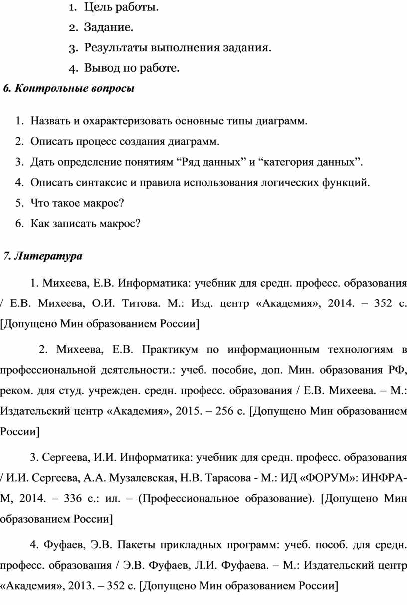 2. Михеева, Е.В. Практикум по информационным технологиям в профессиональной деятельности.: учеб. пособие, доп. Мин. образования РФ, реком. для студ. учрежден. средн. професс. образования / Е.В. Михеева. – М.: Издательский центр «Академия», 2015. – 256 с. [Допущено Мин образованием России]