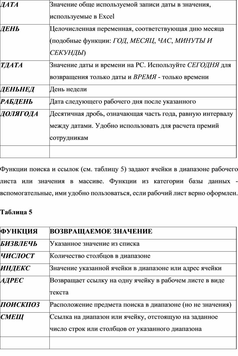 Функции даты и времени (см. Таблицу 4) позволяют создавать формулы, производящие вычисления в зависимости от времени и даты а также выполнять вычисления с датами. Excel использует специальные числа (значения даты) для хранения и оперирования датами. Для преобразования обычных дат в значения, используемые в Excel, можно использовать функцию ДАТА. Функции ДЕНЬ, ГОД и МЕСЯЦ преобразуют значения дат в понятные человеку.