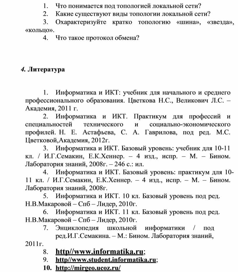 3. Информатика и ИКТ. Базовый уровень: учебник для 10-11 кл. / И.Г.Семакин, Е.К.Хеннер. – 4 изд., испр. – М. – Бином. Лаборатория знаний, 2008г. – 246 с.: ил.