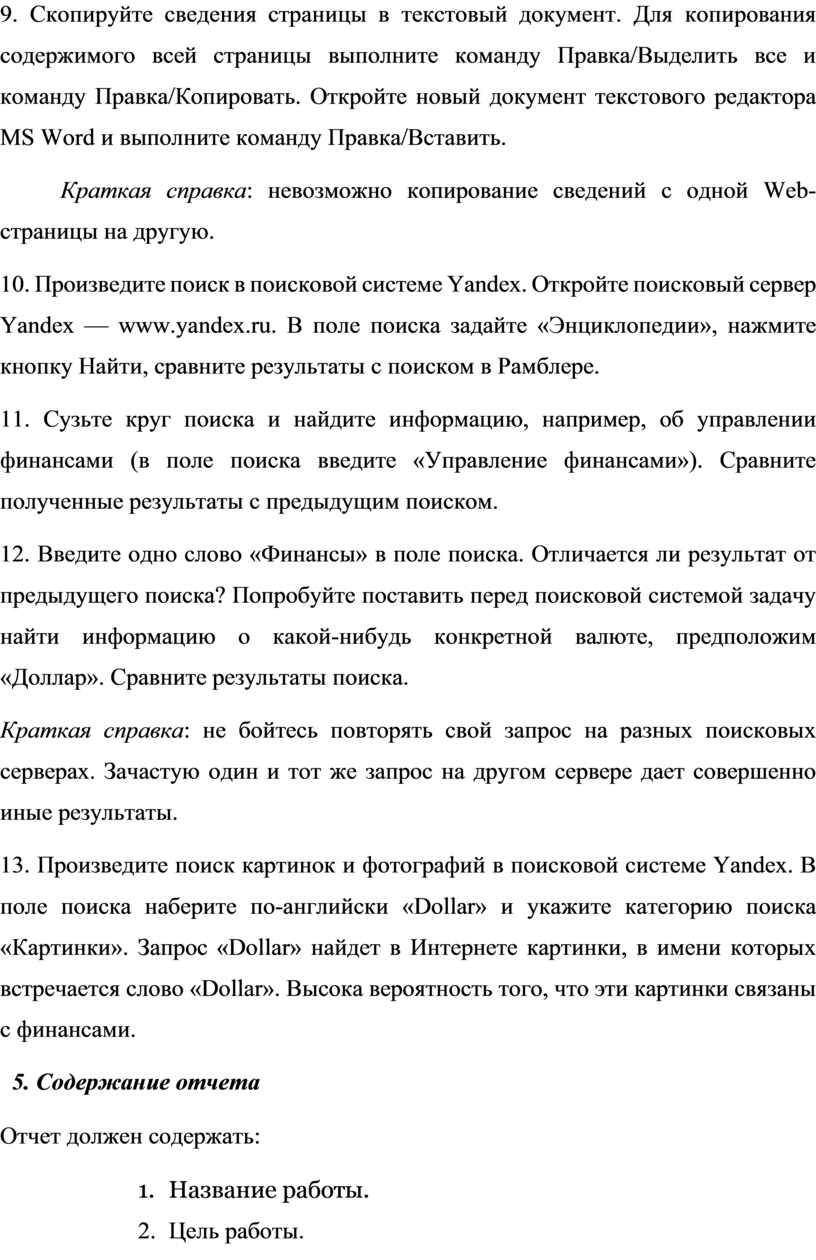 12. Введите одно слово «Финансы» в поле поиска. Отличается ли результат от предыдущего поиска? Попробуйте поставить перед поисковой системой задачу найти информацию о какой-нибудь конкретной валюте, предположим «Доллар». Сравните результаты поиска.