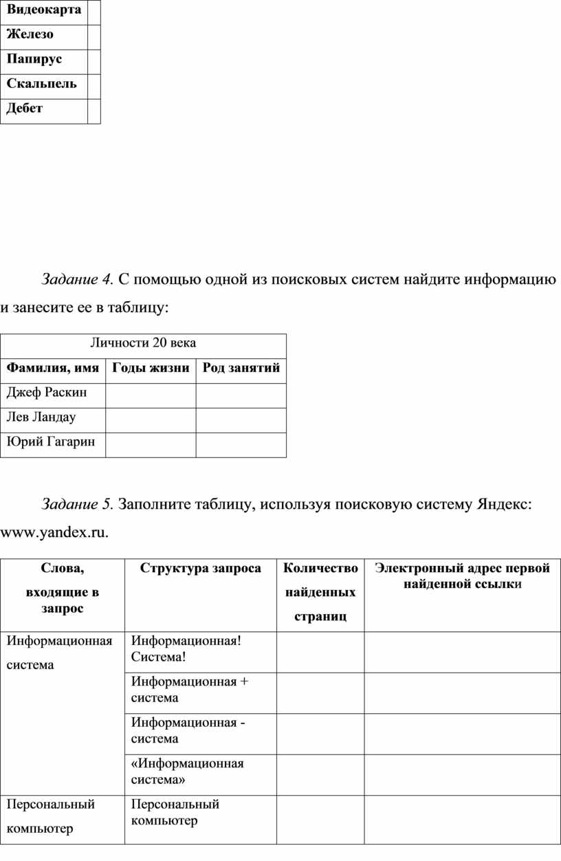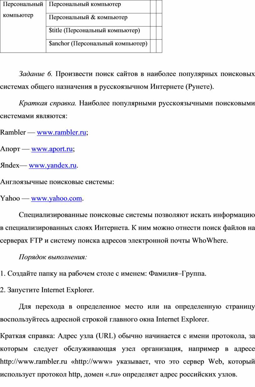 Задание 5. Заполните таблицу, используя поисковую систему Яндекс: www.yandex.ru.
