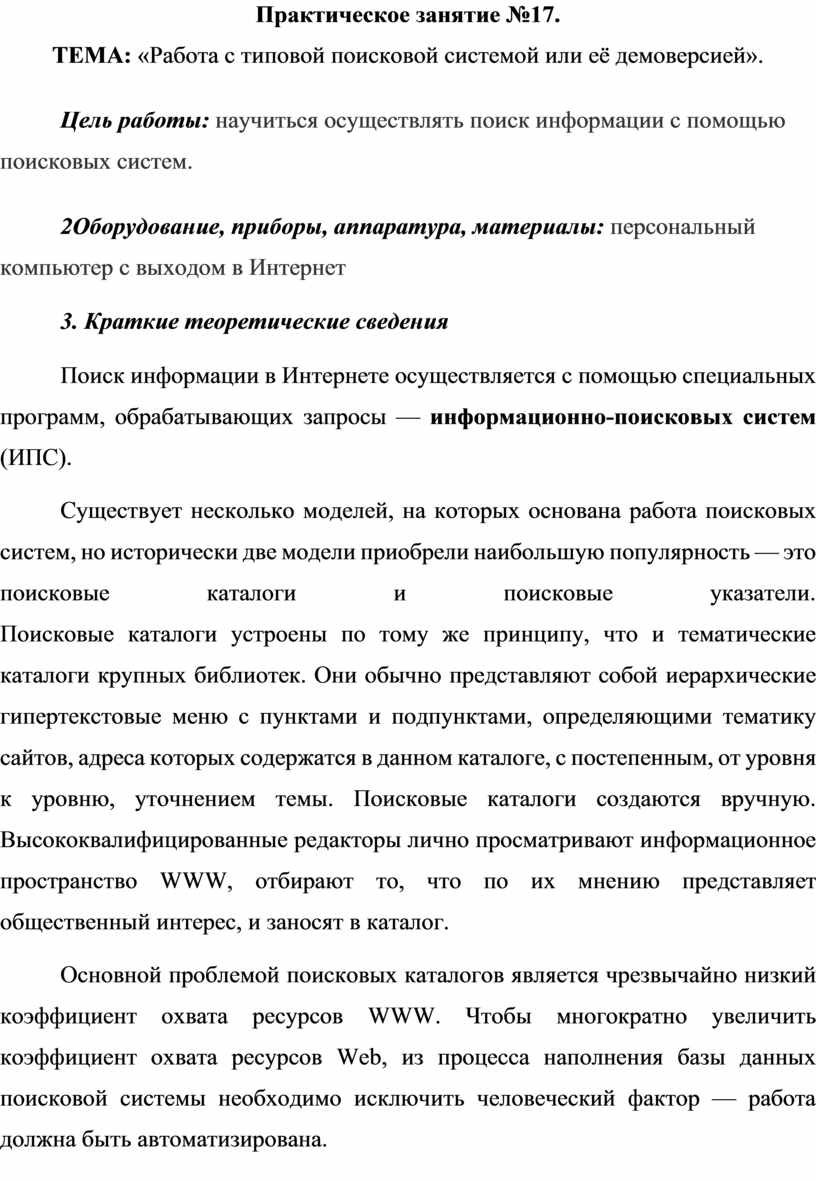 ТЕМА: «Работа с типовой поисковой системой или её демоверсией».