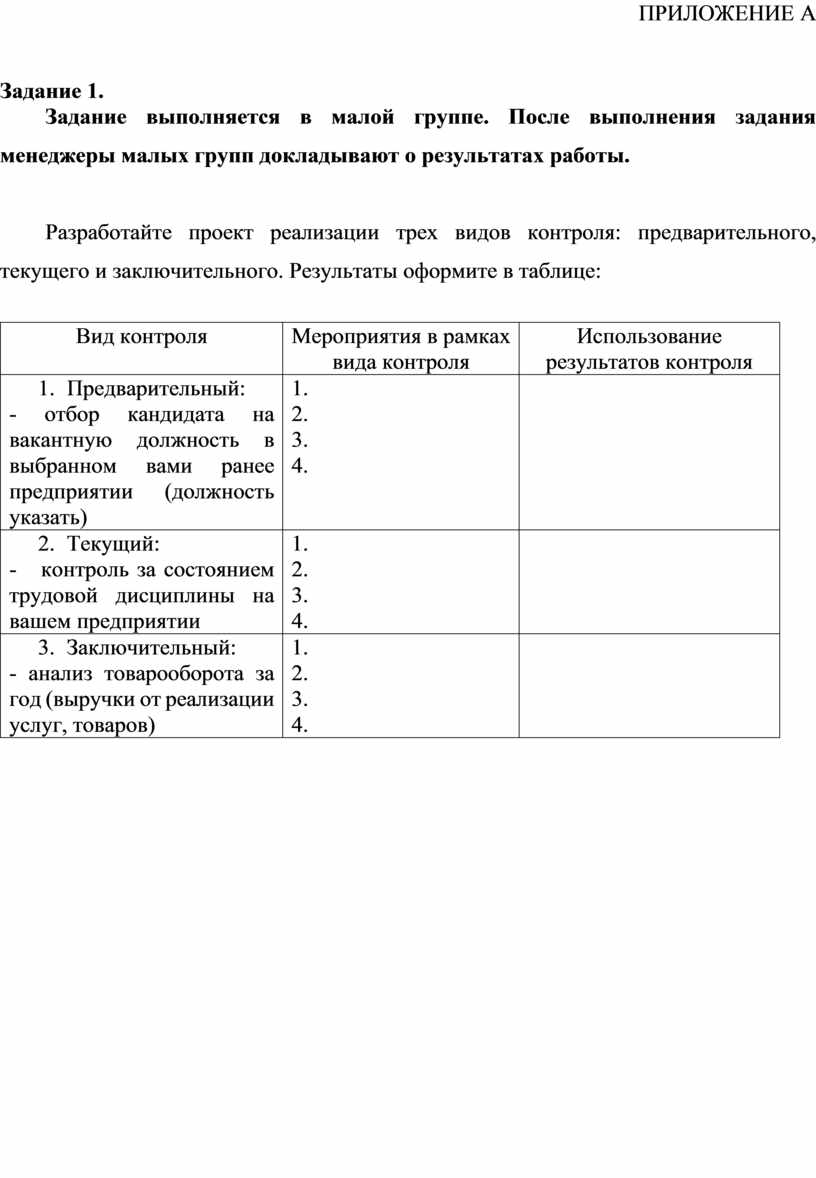Разработайте проект реализации трех видов контроля: предварительного, текущего и заключительного. Результаты оформите в таблице: