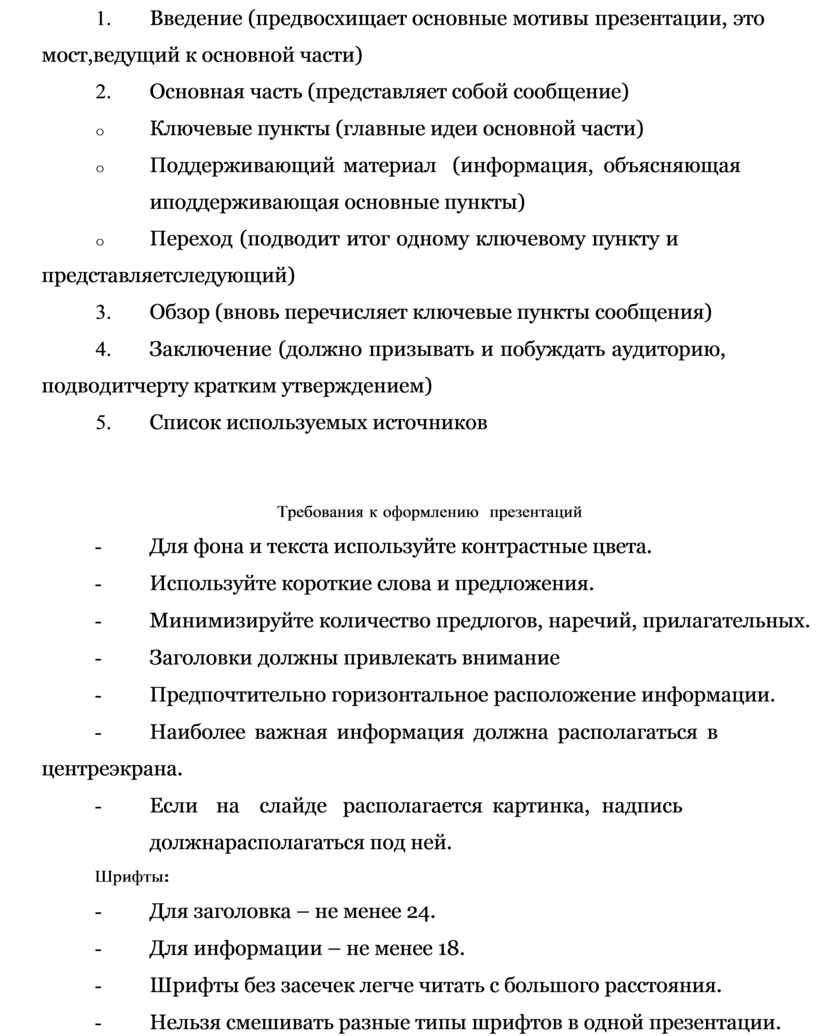 2. Текст. Нужно избегать сплошного текста. Лучше использовать нумерованные и маркированные списки, но не нужно использовать уровень вложения в списках глубже двух. Не нужно переносить. Лучше разместить короткие тезисы, даты, имена, термины, которые часто переспрашиваются