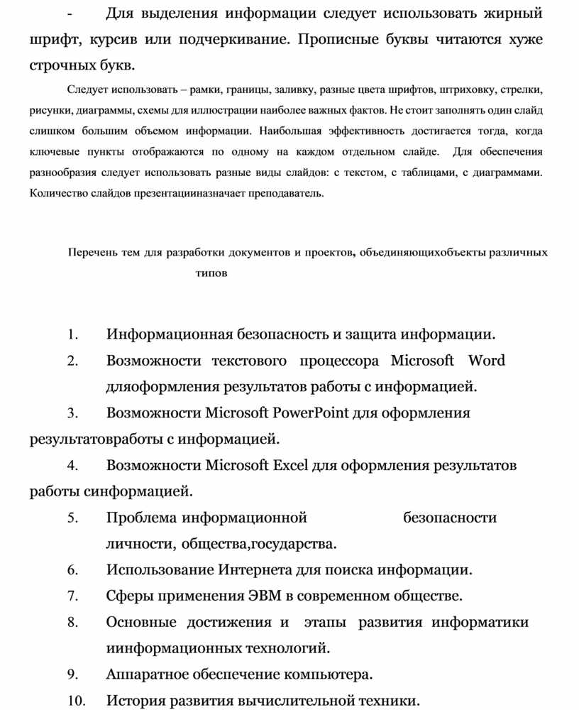 Следует использовать – рамки, границы, заливку, разные цвета шрифтов, штриховку, стрелки, рисунки, диаграммы, схемы для иллюстрации наиболее важных фактов. Не стоит заполнять один слайд слишком большим объемом информации. Наибольшая эффективность достигается тогда, когда ключевые пункты отображаются по одному на каждом отдельном слайде. Для обеспечения разнообразия следует использовать разные виды слайдов: с текстом, с таблицами, с диаграммами. Количество слайдов презентации назначает преподаватель.
