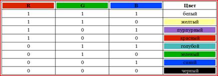 Если кодировать цвет одной точки изображения тремя битами (по одному биту на каждый цвет RGB), то мы получим все восемь различных цветов