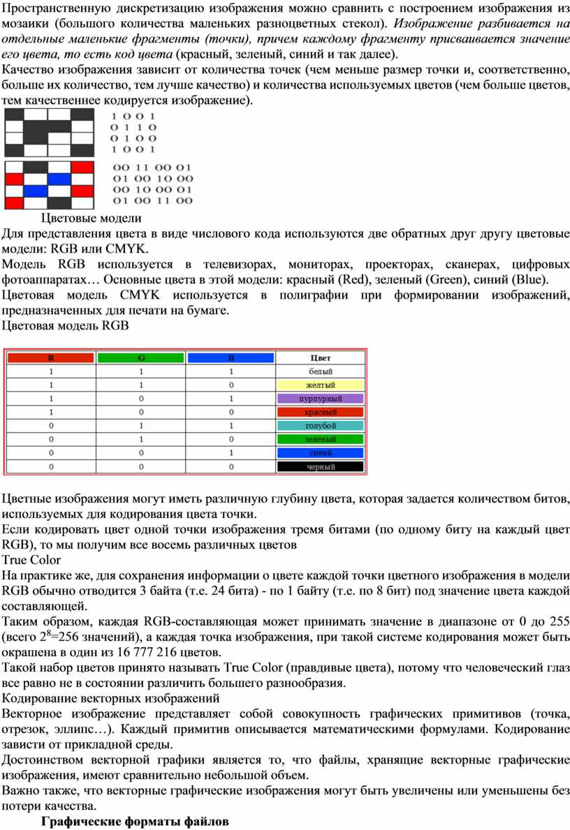 Пространственную дискретизацию изображения можно сравнить с построением изображения из мозаики (большого количества маленьких разноцветных стекол). Изображение разбивается на отдельные маленькие фрагменты (точки), причем каждому фрагменту присваивается значение его цвета, то есть код цвета (красный, зеленый, синий и так далее).