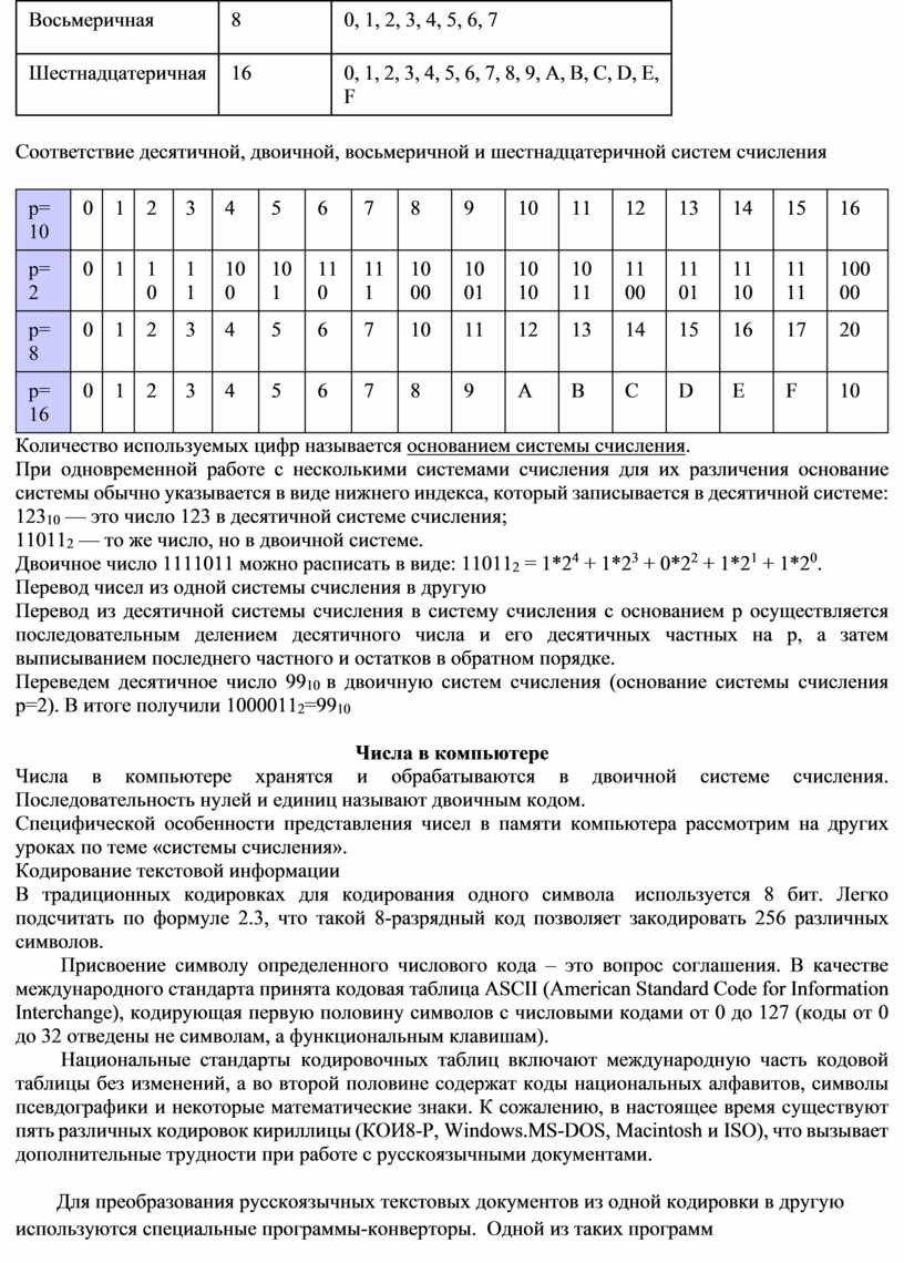 В настоящее время наиболее распространены десятичная, двоичная, восьмеричная и шестнадцатеричная системы счисления.