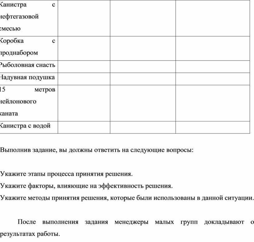 Вы потерпели кораблекрушение в южной части Тихого океана. Основная ваша задача – продержаться до прибытия спасателей. Для этого у вас имеются: надувной плот, тысяча рублей и коробок спичек. Кроме этого, вы должны взять с собой все нижеперчисленные предметы, проранжировав их в порядке очередности (с 1 по 15). На первом этапе работа выполняется строго индивидуально, на втором – решение принимается группой, на третьем – вам дается экспертная оценка.