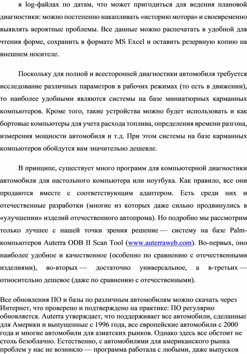 В принципе, существует много программ для компьютерной диагностики автомобиля для настольного компьютера или ноутбука. Как правило, все они продаются вместе с соответствующим адаптером. Есть среди них и отечественные разработки (многие из которых даже сильно продвинулись в «улучшении» изделий отечественного автопрома). Но подробно мы рассмотрим только лучшее с нашей точки зрения решение — систему на базе Palm-компьютеров Auterra ODB II Scan Tool (www.auterraweb.com). Во-первых, оно наиболее удобное и качественное (особенно по сравнению с отечественными изделиями), во-вторых — достаточно универсальное, а в-третьих — относительно дешевое (даже по сравнению с отечественными).