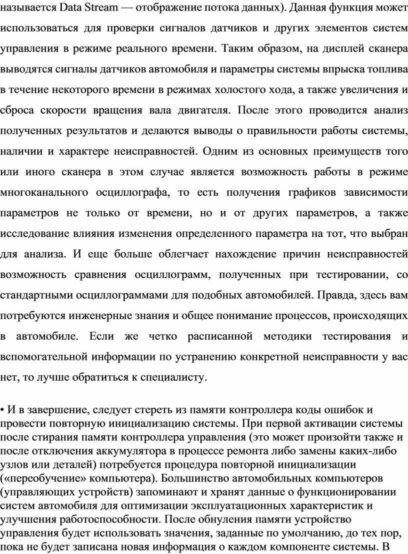 • Далее необходимо, чтобы сканер «взял» проверяемую машину, то есть разрешил просмотр данных в режиме реального времени (эта функция обычно называется Data Stream — отображение потока данных). Данная функция может использоваться для проверки сигналов датчиков и других элементов систем управления в режиме реального времени. Таким образом, на дисплей сканера выводятся сигналы датчиков автомобиля и параметры системы впрыска топлива в течение некоторого времени в режимах холостого хода, а также увеличения и сброса скорости вращения вала двигателя. После этого проводится анализ полученных результатов и делаются выводы о правильности работы системы, наличии и характере неисправностей. Одним из основных преимуществ того или иного сканера в этом случае является возможность работы в режиме многоканального осциллографа, то есть получения графиков зависимости параметров не только от времени, но и от других параметров, а также исследование влияния изменения определенного параметра на тот, что выбран для анализа. И еще больше облегчает нахождение причин неисправностей возможность сравнения осциллограмм, полученных при тестировании, со стандартными осциллограммами для подобных автомобилей. Правда, здесь вам потребуются инженерные знания и общее понимание процессов, происходящих в автомобиле. Если же четко расписанной методики тестирования и вспомогательной информации по устранению конкретной неисправности у вас нет, то лучше обратиться к специалисту.