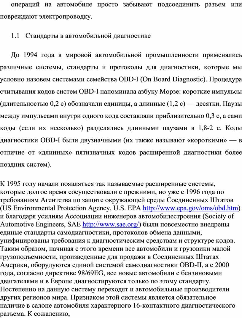 До 1994 года в мировой автомобильной промышленности применялись различные системы, стандарты и протоколы для диагностики, которые мы условно назовем системами семейства OBD-I (On Board Diagnostic). Процедура считывания кодов систем OBD-I напоминала азбуку Морзе: короткие импульсы (длительностью 0,2 с) обозначали единицы, а длинные (1,2 с) — десятки. Паузы между импульсами внутри одного кода составляли приблизительно 0,3 с, а сами коды (если их несколько) разделялись длинными паузами в 1,8-2 с. Коды диагностики OBD-I были двузначными (их также называют «короткими» — в отличие от «длинных» пятизначных кодов расширенной диагностики более поздних систем).