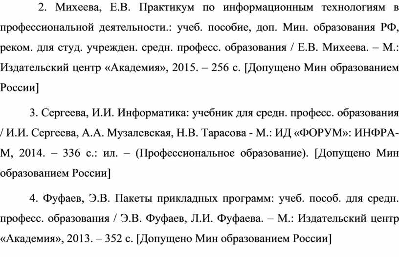 2. Михеева, Е.В. Практикум по информационным технологиям в профессиональной деятельности.: учеб. пособие, доп. Мин. образования РФ, реком. для студ. учрежден. средн. професс. образования / Е.В. Михеева. – М.: Издательский центр «Академия», 2015. – 256 с. [Допущено Мин образованием России]