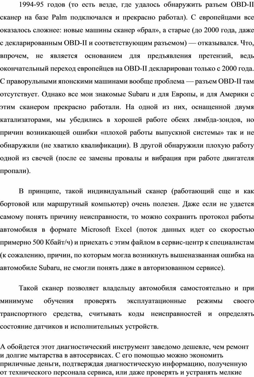 В принципе, такой индивидуальный сканер (работающий еще и как бортовой или маршрутный компьютер) очень полезен. Даже если не удается самому понять причину неисправности, то можно сохранить протокол работы автомобиля в формате Microsoft Excel (поток данных идет со скоростью примерно 500 Кбайт/ч) и приехать с этим файлом в сервис-центр к специалистам (к сожалению, причин, по которым могла возникнуть вышеназванная ошибка на автомобиле Subaru, не смогли понять даже в авторизованном сервисе).