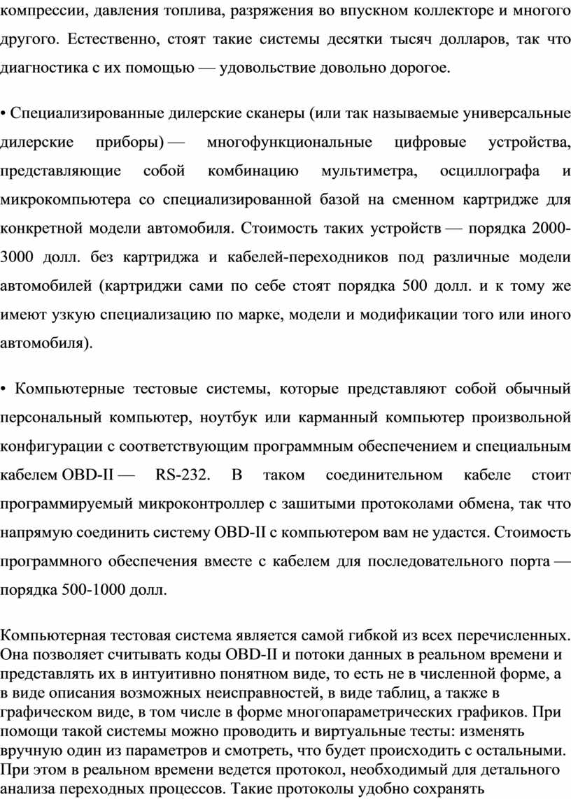 Компьютерная тестовая система является самой гибкой из всех перечисленных. Она позволяет считывать коды OBD-II и потоки данных в реальном времени и представлять их в интуитивно понятном виде, то есть не в численной форме, а в виде описания возможных неисправностей, в виде таблиц, а также в графическом виде, в том числе в форме многопараметрических графиков. При помощи такой системы можно проводить и виртуальные тесты: изменять вручную один из параметров и смотреть, что будет происходить с остальными. При этом в реальном времени ведется протокол, необходимый для детального анализа переходных процессов. Такие протоколы удобно сохранять в log-файлах по датам, что может пригодиться для ведения плановой диагностики: можно постепенно накапливать «историю мотора» и своевременно выявлять вероятные проблемы. Все данные можно распечатать в удобной для чтения форме, сохранить в формате MS Excel и оставить резервную копию на внешнем носителе.