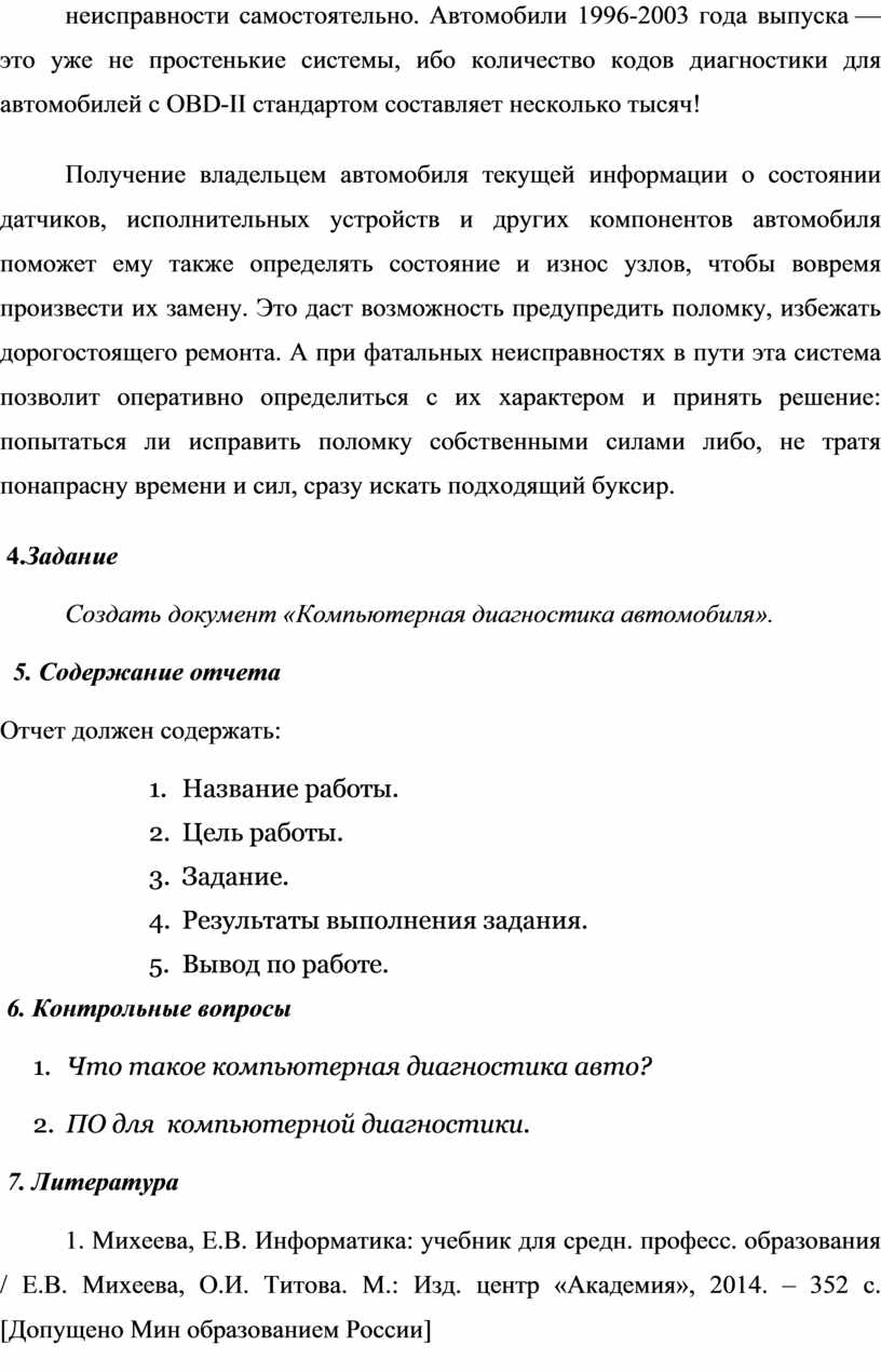 ТЕМА: «Создание документа «Компьютерная диагностика автомобиля»».