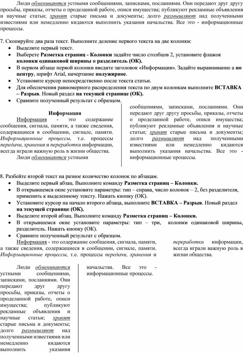 7. Скопируйте два раза текст. Выполните деление первого текста на две колонки: