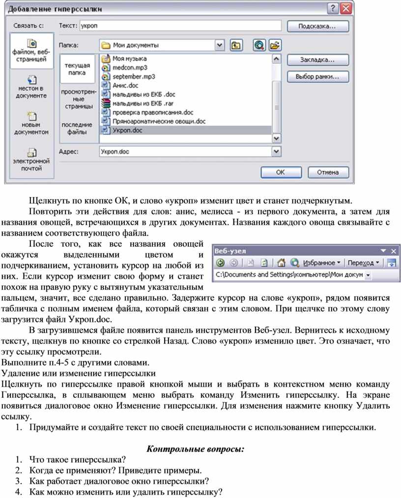 2. Нужно связать эти тексты в гипертекст. Для этого в первом тексте выделить слово «укроп». В меню Вставка выбрать команду Гиперссылка. На экране появится окно диалога Добавление гиперссылки, в котором нужно найти необходимый файл.